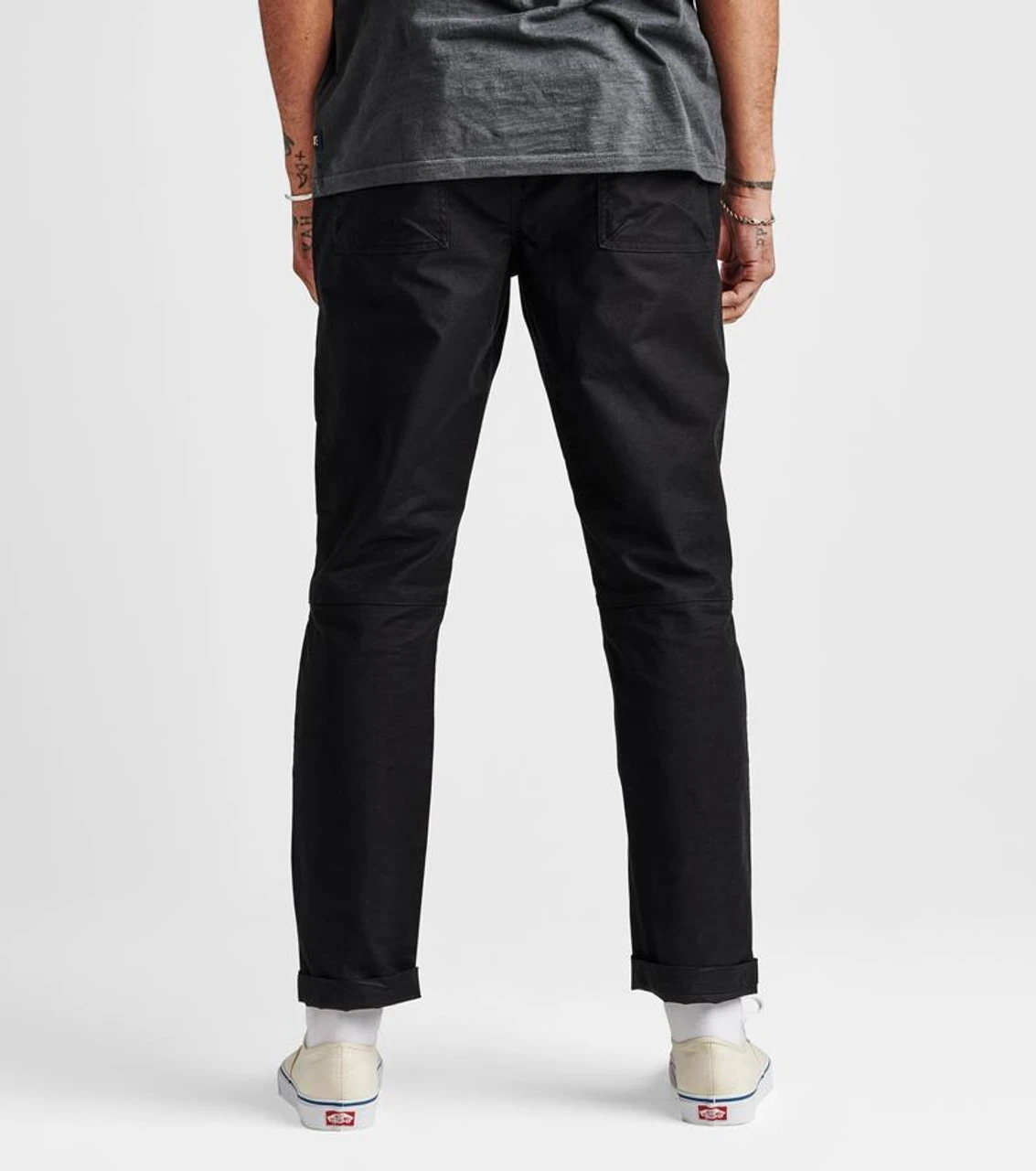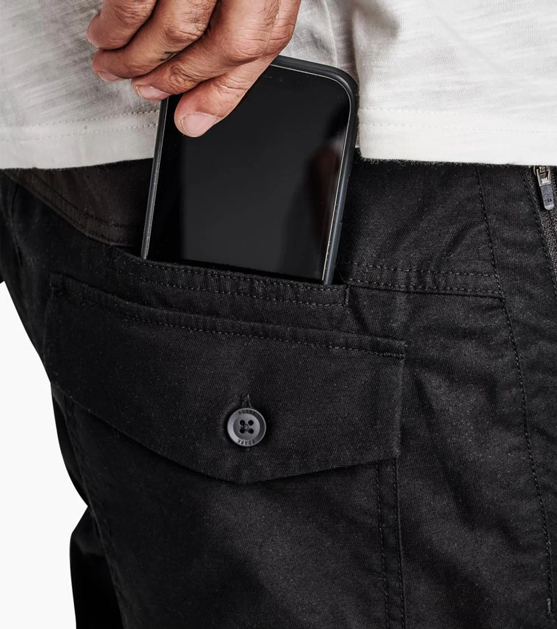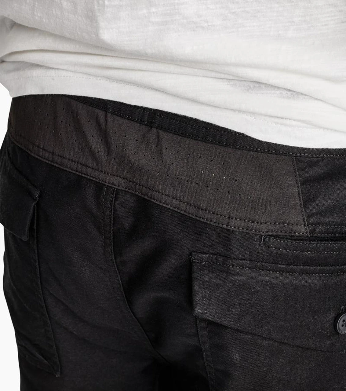 A new and evolved version of our, slim, straight fit, travel pant. Drawstring closure that wraps entire  waistband with zipper fly, front extended long zip pocket with internal stash sleeve intended to accommodate all travel documents. Back patch pocket with button closure and small stash pocket at back yoke for quick cell phone storage.The back yoke vented mesh panel now constructed with laser cut perforations  for breathability and comfort.