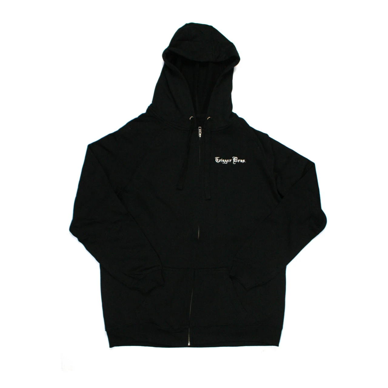 Trigger Bros Embroidered LW Zip Hoodie Mens in Black is a relaxed fitting, unisex zip through hoodie featuring a metal zip, drawcord hood, front pockets and embroidered Trigger Bros Old English logo.