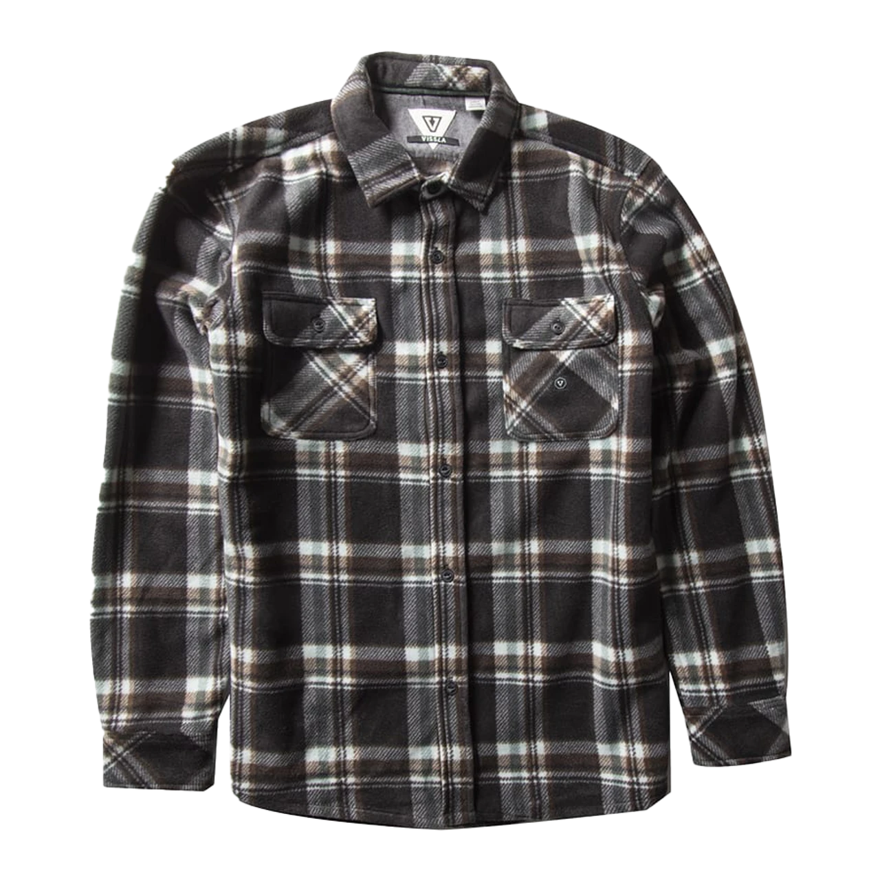 - Front chest pockets with button down flap and hand pockets Vissla woven label trims